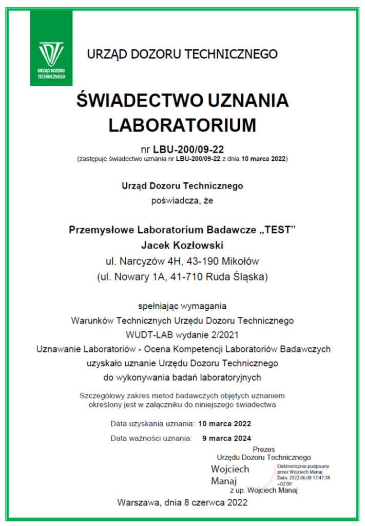 Przemysłowe Laboratorium Badawcze „TEST” działa od grudnia 2007 roku, szybko uzyskując uznanie CLDT UDT jako laboratorium stopnia II zgodne z normą PN EN ISO/IEC 17025:2005. Dzięki współpracy z TÜV NORD Polska, TÜV Thüringen oraz Lloyds Register Polska, certyfikujemy personel zgodnie z amerykańskimi przepisami SNT-TC-1A. Nowoczesny sprzęt i doświadczony zespół pozwalają nam na kompleksowe przeprowadzanie badań.